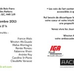 Sous l’égide de la Galerie Exhib’art, je partiperai à ce symposium qui aura lieu le 28 et 29 septembre sur la grande place des Bois-Franc, 2555 place des Nations, Ville St-Laurent. Je serai là entre 11:00 et 17:00. On se souhaite du beau temps, venez célébrer les journées de la culture.